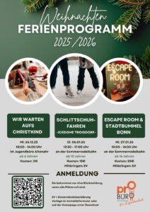 Zum Abschluss der Ferien wartet am Mittwoch, 7. Januar 2026, ein besonderes Highlight auf Jugendliche ab 14 Jahren: ein Ausflug nach Bonn mit spannendem Escape-Room-Abenteuer und anschließendem Stadtbummel. Die Aktion dauert von 10:00 bis 16:00 Uhr. Treffpunkt ist ebenfalls an der Sommerrodelbahn.
