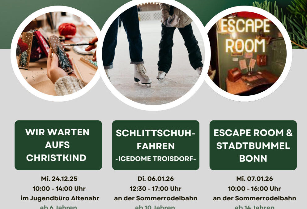 Das Jugendbüro Altenahr lädt Kinder und Jugendliche auch in diesen Weihnachtsferien zu spannenden und abwechslungsreichen Aktionen ein. Mit kreativen, sportlichen und abenteuerlichen Angeboten sorgt das Team dafür, dass keine Langeweile aufkommt.